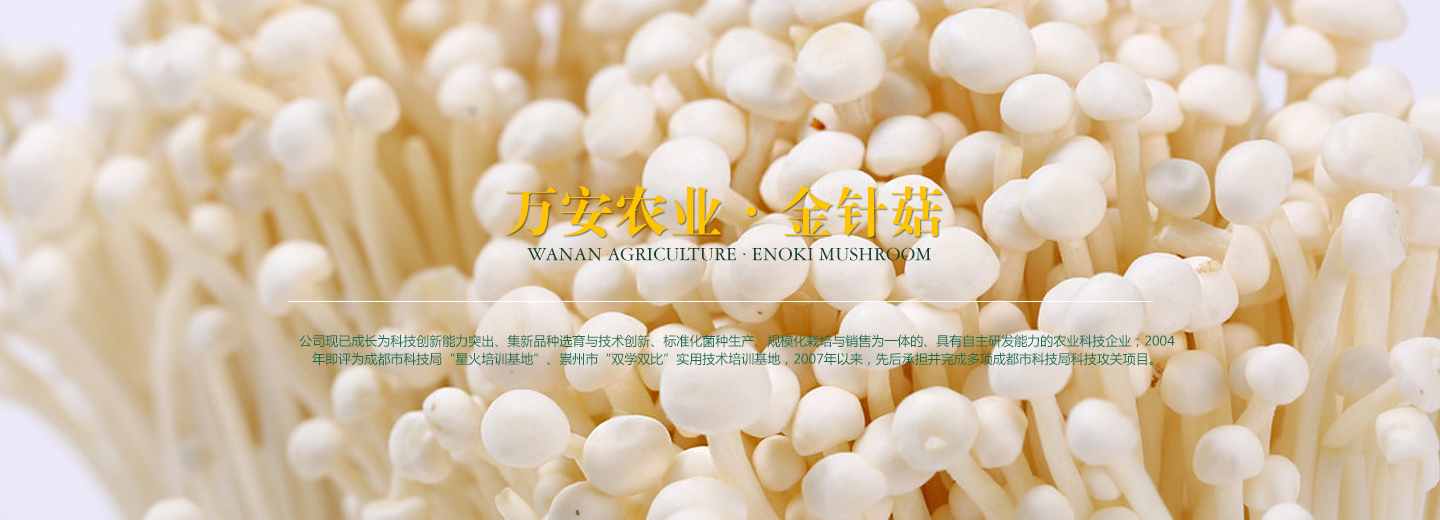 四川万安农业科技发展有限公司注册成立于2003年,注册资金200万元,经营范围:食用菌栽培菌种生产、销售与菌类加工;水果、蔬菜种植、销售;生物农药、新型肥料的研发与推广;农业产业化技术咨询与技术服务。